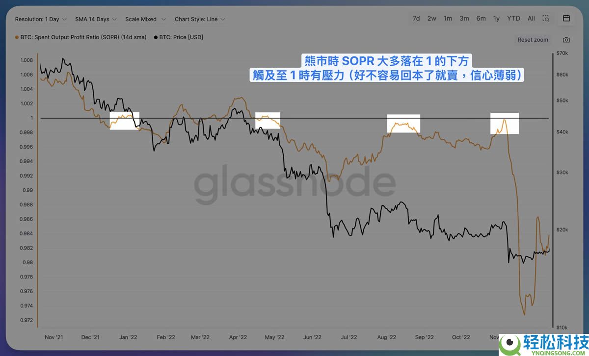 换句话说,熊市的SOPR = 心态面的阻力线。一旦市场信心薄弱,回本就卖,价格自然难以上去。